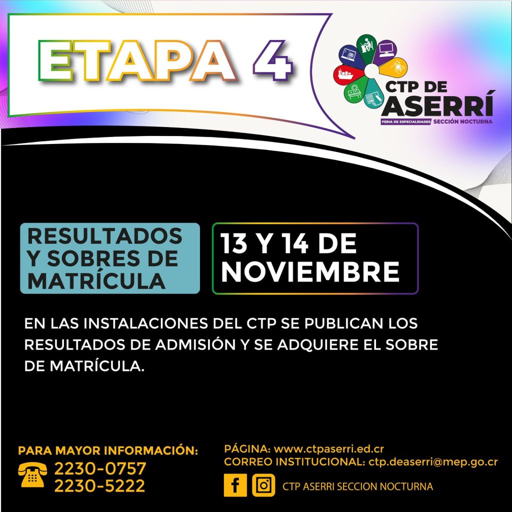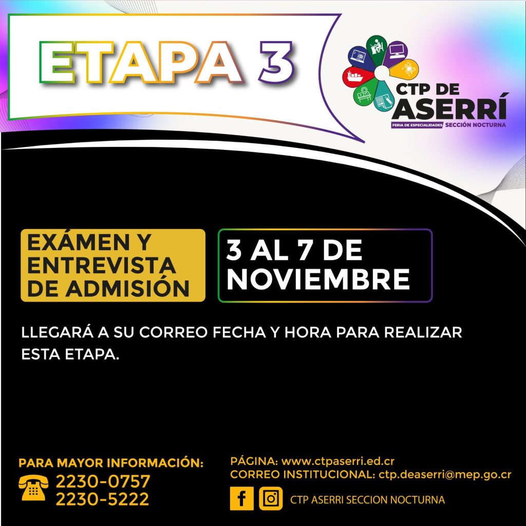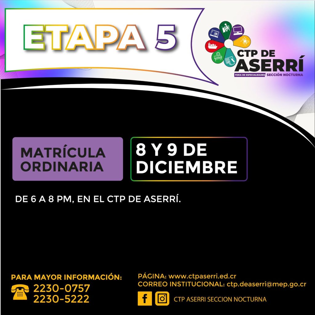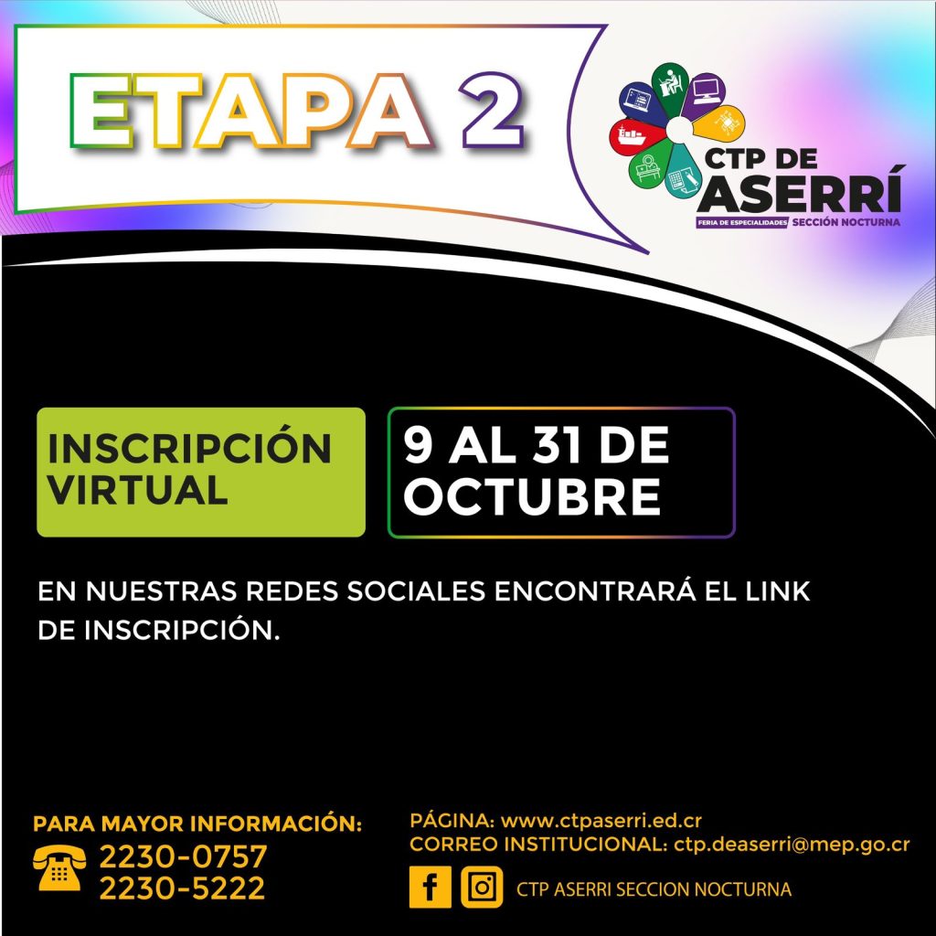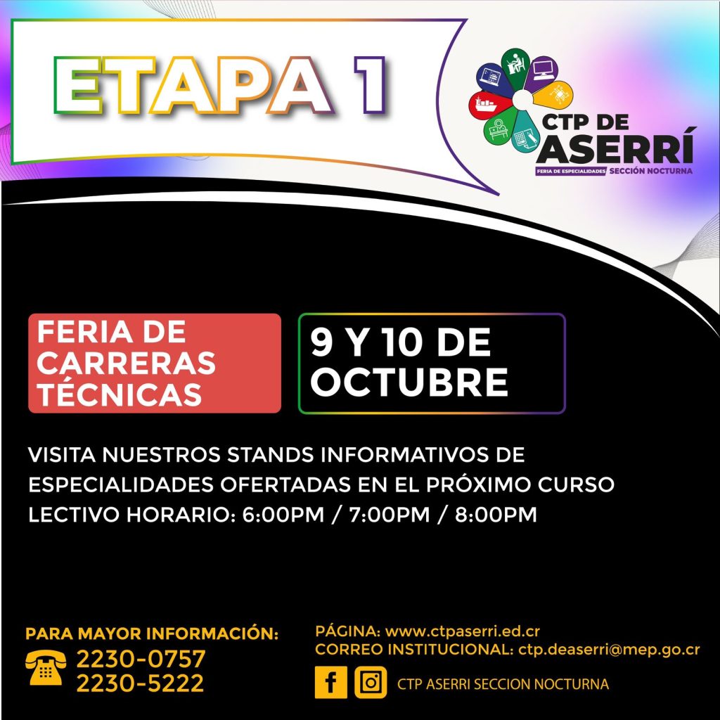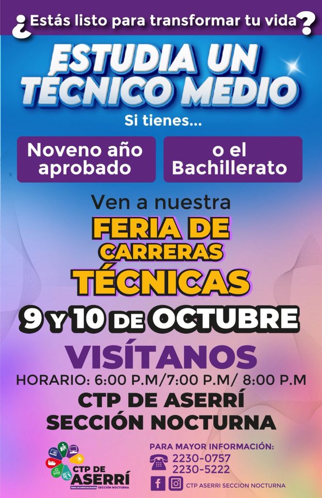 El próximo jueves 9 y viernes 10 de octubre tendremos las puertas abiertas del CTP DE ASERRÍ, sección nocturna, para recibirte en la NOCHE DE INDUCCIÓN, donde podrás realizar un recorrido por cada una de las especialidades y conocer todos los detalles para que puedas ELEGIR LA DE TU INTERÉS, y realizar el PROCESO DE ADMISIÓN para el curso lectivo 2026.